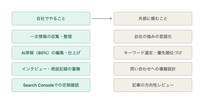 全体を外注するより、「方向性の設計と判断」に外部の知見を使い、実際のコンテンツ制作は社内で一次情報を持つ人間が担当するという分業が、現実的には機能しやすいです。