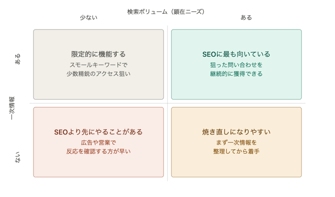 まず確認すべきは「うちのサイトに来訪者が来たら問い合わせが発生するか」。そこがYesなら、次は「狙えるキーワードに検索ボリュームがあるか」。この2点が揃っていれば、取り組む価値があります。