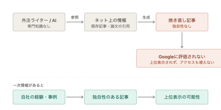 - 独自性のないコンテンツ:外注ライターもAIも、一次情報がなければ焼き直しにしかならない