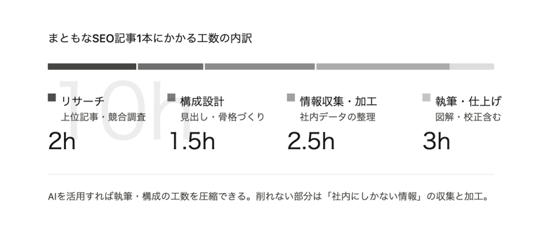 リサーチ・構成設計・社内情報の収集と加工・本文執筆・図解や画像の検討まで含めると、慣れていない担当者が1本の記事を丁寧に作ろうとすると10時間程度かかることも珍しくありません。