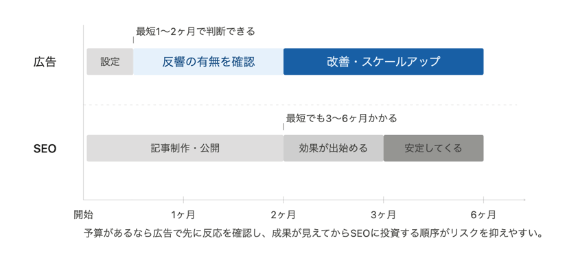 予算に余裕があるなら、広告から始めることをお勧めするケースが多いです。広告は1〜2ヶ月で反響の有無と質を確認できますが、SEOは半年以上かかることもあります。まず広告で市場の反応を見てからSEOの方向性を決めるほうが、リスクが低く判断材料も揃いやすいです。